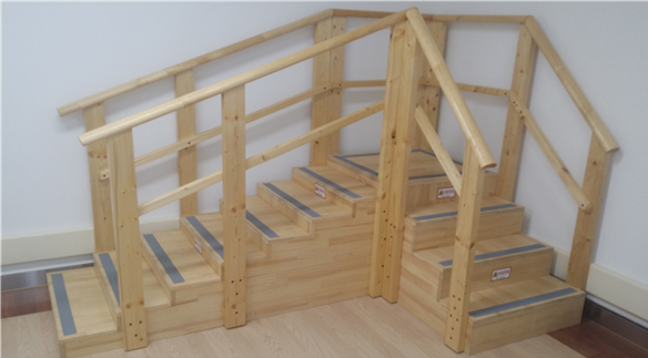 하지 근력이 약한 환자분들이 근력 회복 및 증대를 위한 계단 오르내리기 연습을 할 수 있도록 만들어진 기구입니다 공간 효율성을 극대화시켜 좁은 공간에서의 훈련이 가능하며 환자 보호를 위한 난간 손잡이와 논슬립 시트가 부착되어 있어 안정성이 높습니다
